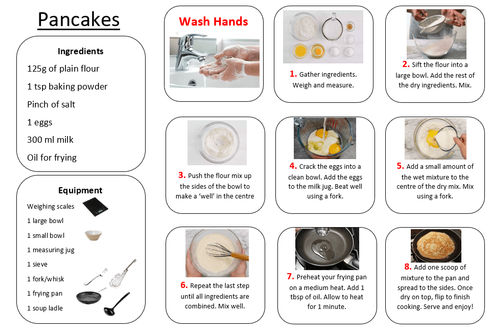 To mark Pancake Tuesday (tomorrow 17th Feb), we are sharing the recipe and steps for making pancakes. These can be served for breakfasts, lunch and/ or dinner with a wide range of toppings! We hope you have fun making with family and friends. Enjoy