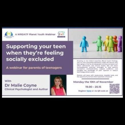 Social Exclusion: “Supporting your teen when they’re feeling socially excluded” on Monday 10th November at 7:00pm, with Dr Malie Coyne.